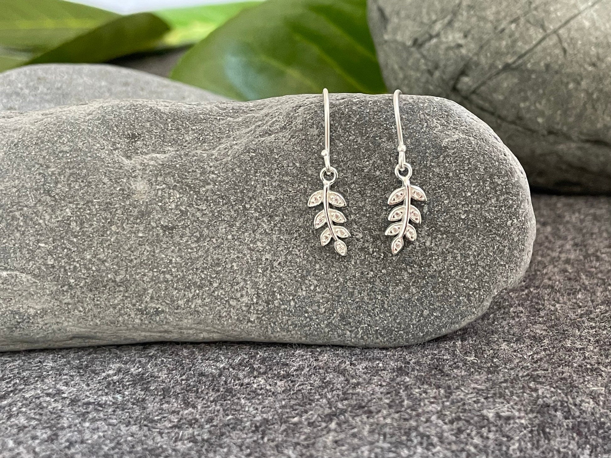 Olive Leaf Drop Earrings - 925 Sterling Silver with Cubic Zirconia CZ, Gift-Ready